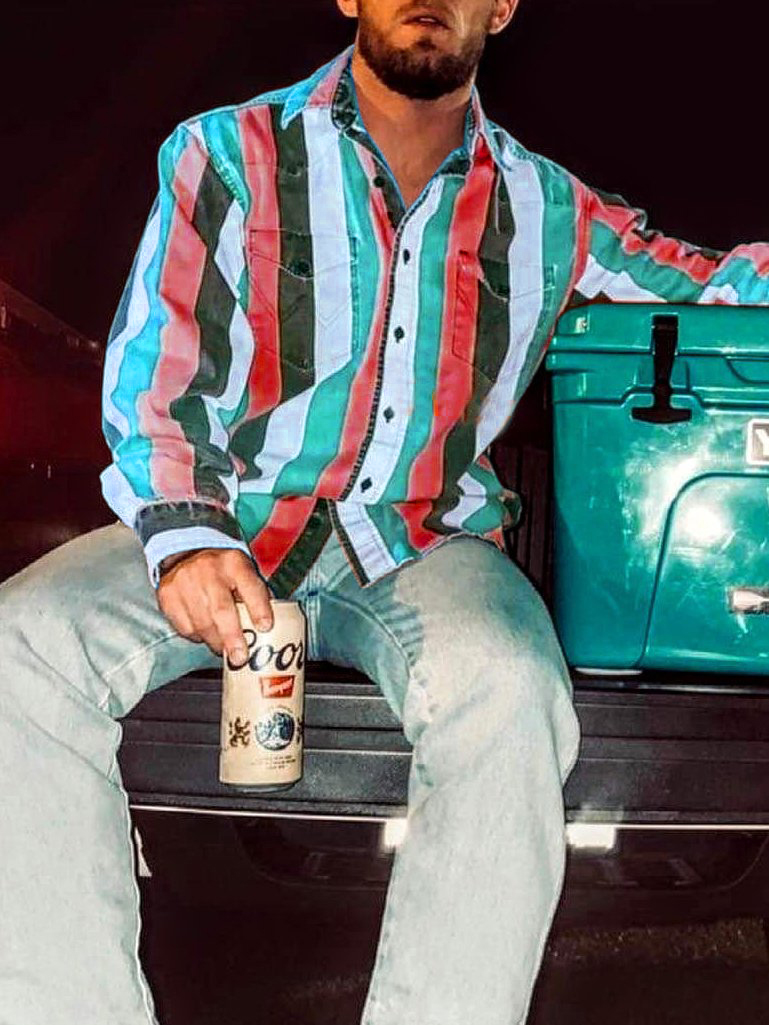 Men's Casual Retro Red and Blue Striped Long Sleeve Shirt